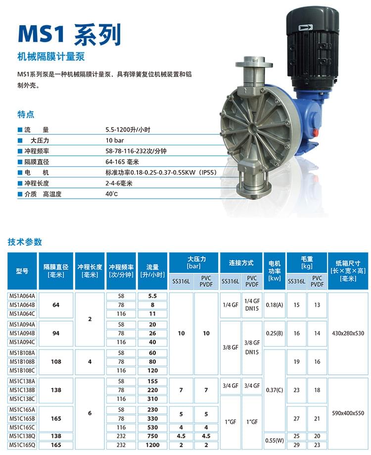 MS1系列泵是一種機(jī)械隔膜計(jì)量泵,具有彈簧復(fù)位機(jī)械裝置和鋁制外殼。