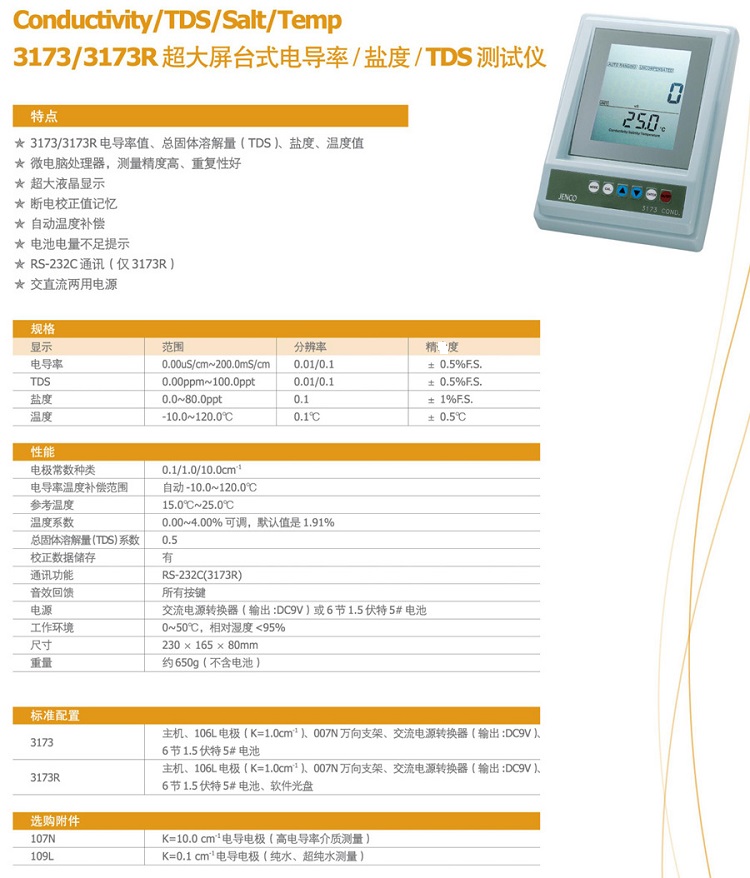 3173R型臺式屏電導(dǎo)/鹽度/TDS計 JENCO/任氏總固體容量檢測儀