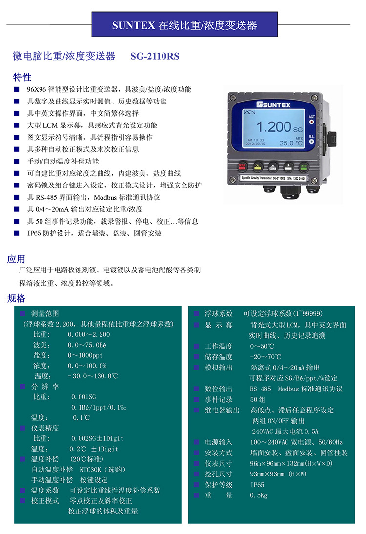 SUNTEX比重計(jì)SG-2110RS波美鹽度濃度微電腦比重變送器