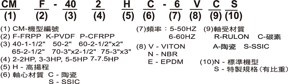 無軸封可拆式磁力耐酸堿泵浦CM型(高揚(yáng)程)技術(shù)規(guī)格: