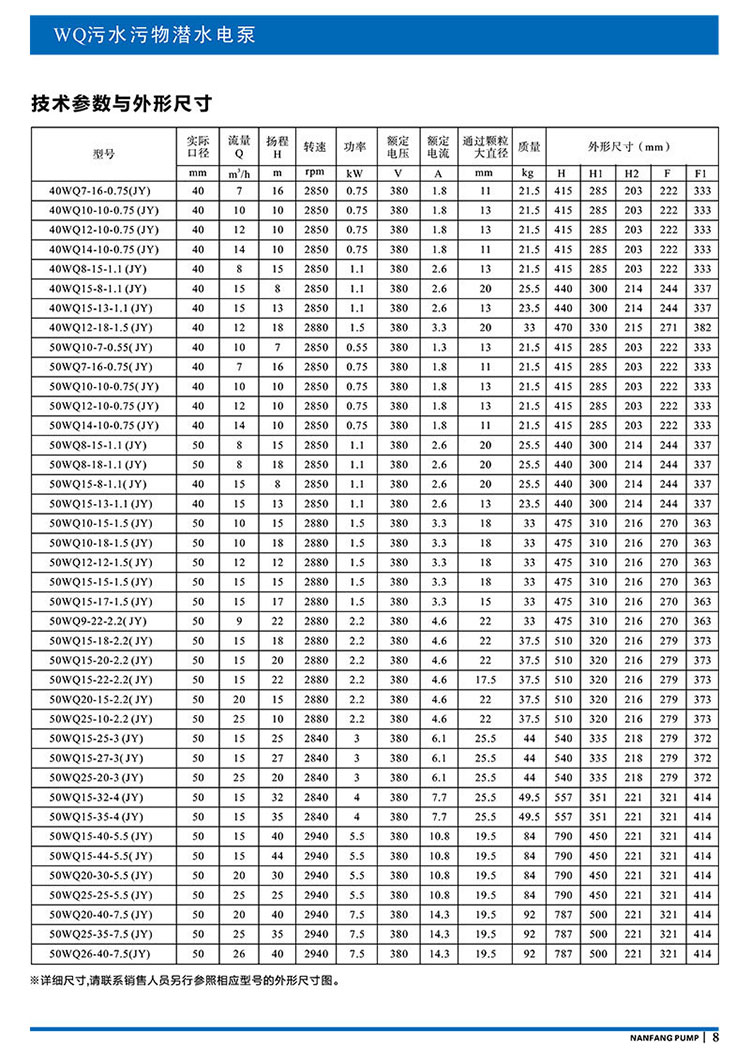 南方潛水泵排污泵50WQ20-15-2.2JY不堵塞高揚(yáng)程污水污物潛水電泵