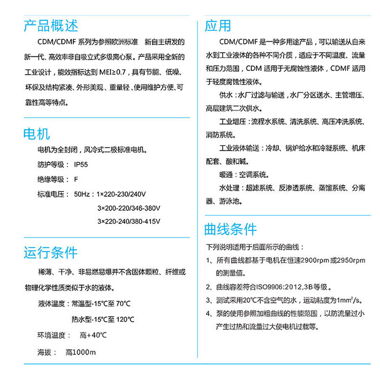南方CDM/CDMF系列為參照歐洲標準新自主研發(fā)的新一代、高效率非自吸立式多級離心泵。產品采用全新的工業(yè)設計,能效指標達到MEI0.7,具有節(jié)能、低噪、環(huán)保及機構緊湊、外觀美觀、重量輕、使用維護方便、可靠性高等特點。