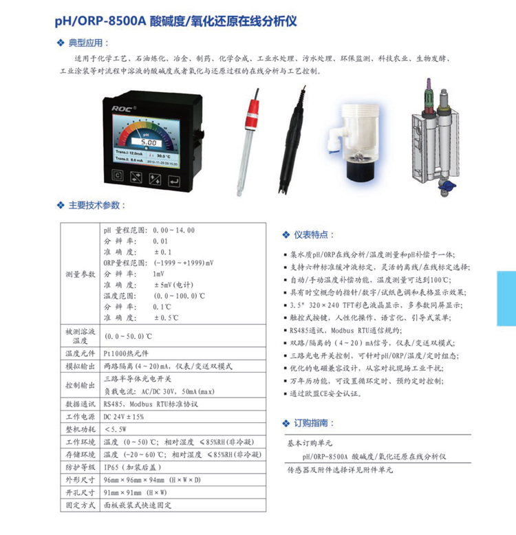 pH/ORP-8500A酸堿度/氧化還原在線分析儀是集pH/ORP/溫度測量于一體的高準(zhǔn)確度、高性價比的酸堿度/氧化還原電位變送控制儀表,以32位ARM處理器為核心的強(qiáng)大內(nèi)核與操作系統(tǒng),使得信息處理速度和測量準(zhǔn)確且穩(wěn)定,在儀表行業(yè)率先采用大型彩色屏幕的多參數(shù)同屏幕顯示。