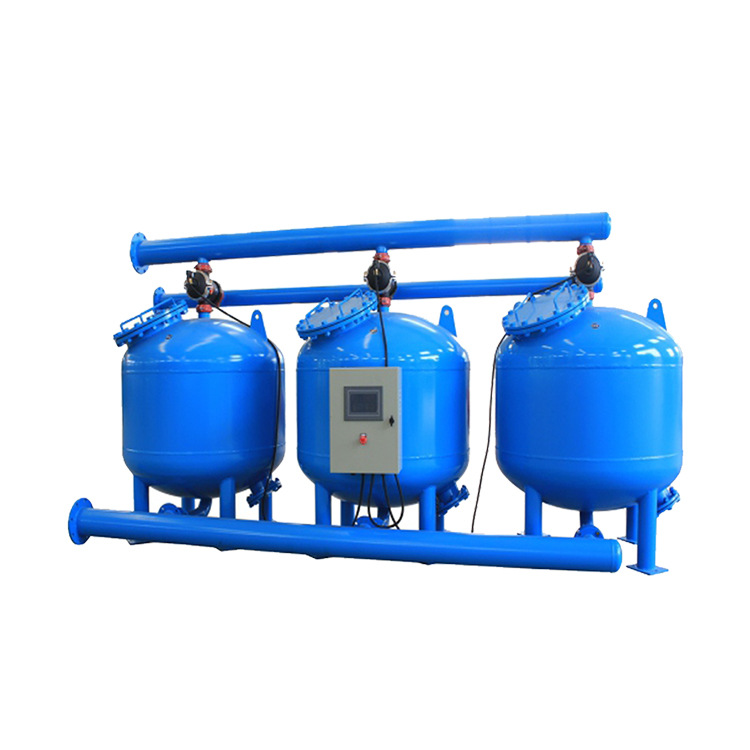 當系統處于反洗狀態(tài)時,過濾仍然繼續(xù),其中要進行反洗的標準單元砂缸不進行過濾,系統中其它標準單元砂缸仍然在過濾。過濾后的清潔水部分用來反洗標準單元砂缸,其余仍送到用戶處。反沖洗污水則通過水力閥的反洗排水口被排出。在高速砂缸全自動過濾系統中,特殊的集水器設計可使填料之間填料相互搓洗,提高反沖洗效率,減少所需的反洗水(清潔水),同時反洗時沒有跑料現象。一個標準單元砂缸反洗為2分鐘,反沖洗結束,標準單元砂缸內部壓頭損失減小到合理范圍,定壓裝置給出復原信號,水力閥恢復到過濾狀態(tài),下一個標準 單元砂缸則準備進入反洗狀態(tài)。