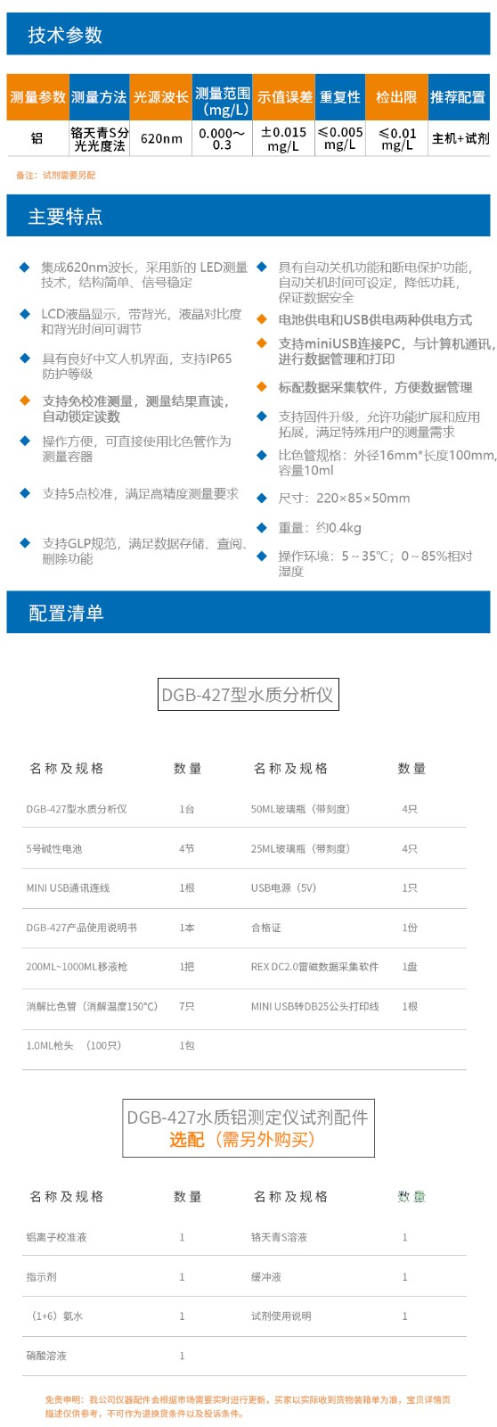 上海雷磁DGB-427便攜式水質(zhì)測(cè)定儀免校準(zhǔn)測(cè)量水質(zhì)分析儀 鋁測(cè)試儀