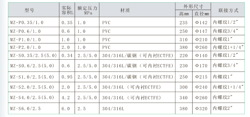 材質(zhì)有304、316、內(nèi)襯式及PVC等,我公司備有以下型號(hào)的產(chǎn)品,可供客戶選擇,若有特殊需求,可單獨(dú)訂購。膜片式脈沖阻尼器高使用壓力為:PVC材質(zhì)的為1.0MPa,金屬材質(zhì)的為2.5MPa,禁止超壓使用,以免殼體破裂發(fā)生危險(xiǎn)。使用溫度不高于75。使用溫度不低于5,建議使用溫度10~45。
