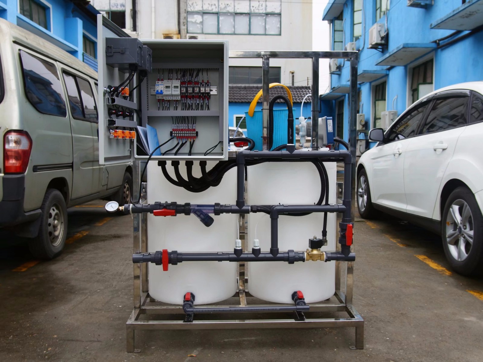 描述:該加藥裝置由主要用于造紙行業(yè)投加各種膠劑。為了保證系統(tǒng)24小時(shí)正常運(yùn)行,該裝置使用一用一備的組合形式,為了管道使用壽命更長(zhǎng),所以管道均采用SS304材質(zhì)及氬氟焊焊接技術(shù)。因造紙行業(yè)各階段的工藝不同,控制需要了解設(shè)備的運(yùn)行狀態(tài)以及當(dāng)前流量,從而更的投加藥劑。