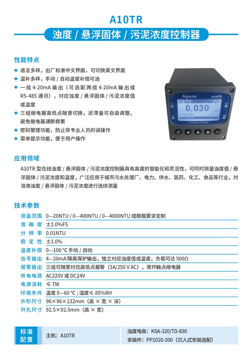 Apure工業(yè)濁度儀A10/A20TR盤裝在線濁度計(jì)懸浮固體污泥濃度 控制器