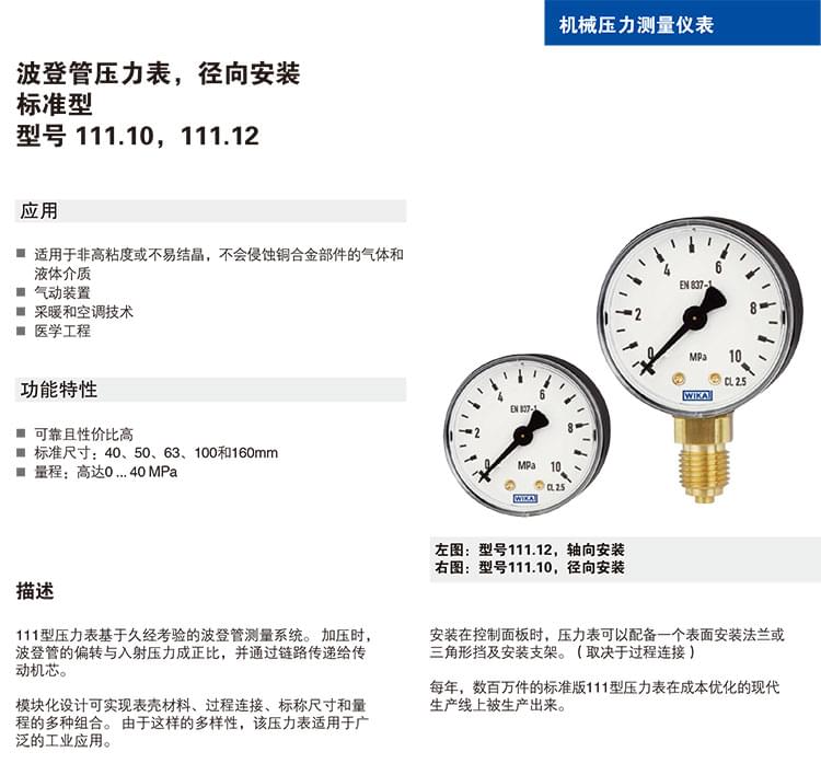 波登管壓力表111.10、111.12型機械壓力測量儀表