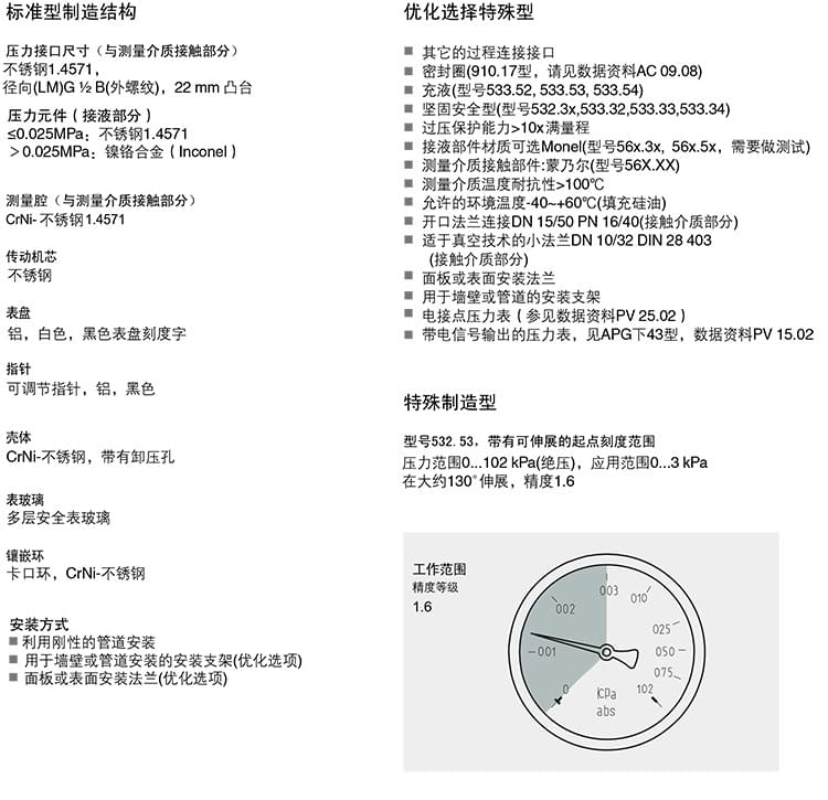 3. 絕壓表,帶有膜片,CrNi-不銹鋼制造結(jié)構(gòu)壓力表:516.11 516.12 532.51 532 .52 532.53 532.54