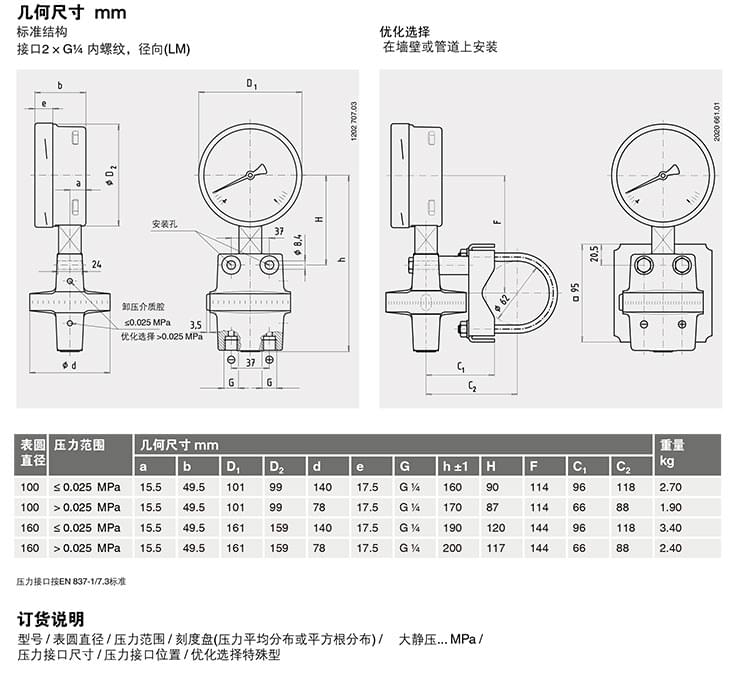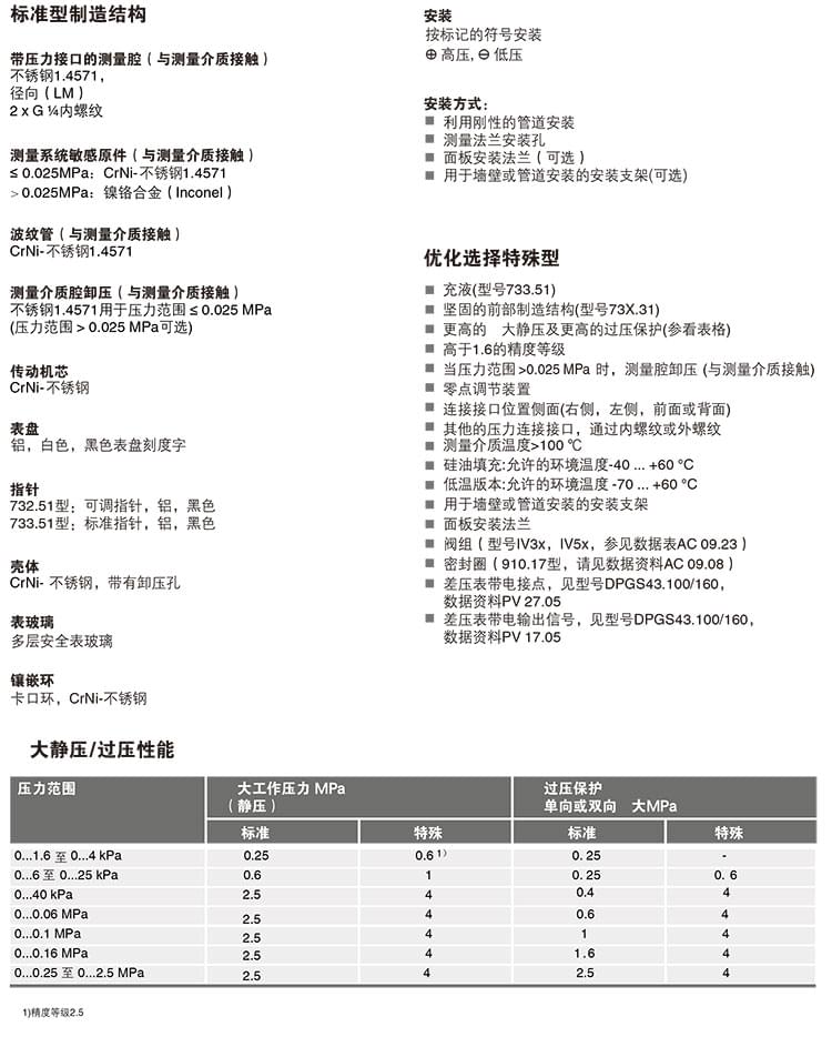 2. 膜片壓力表,化學(xué)工業(yè)型,表頭不充液/充液,高過壓保護(hù)壓力表,針對UHP應(yīng)用:422.12 432.50 432.56 423.36 423.25