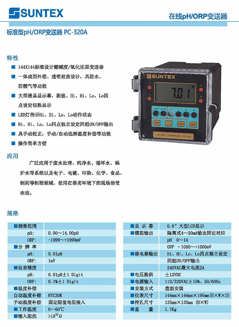 SUNTEX PC-320A標(biāo)準(zhǔn)型PH/ORP控制器 在線ph檢測儀水質(zhì)監(jiān)測分析儀